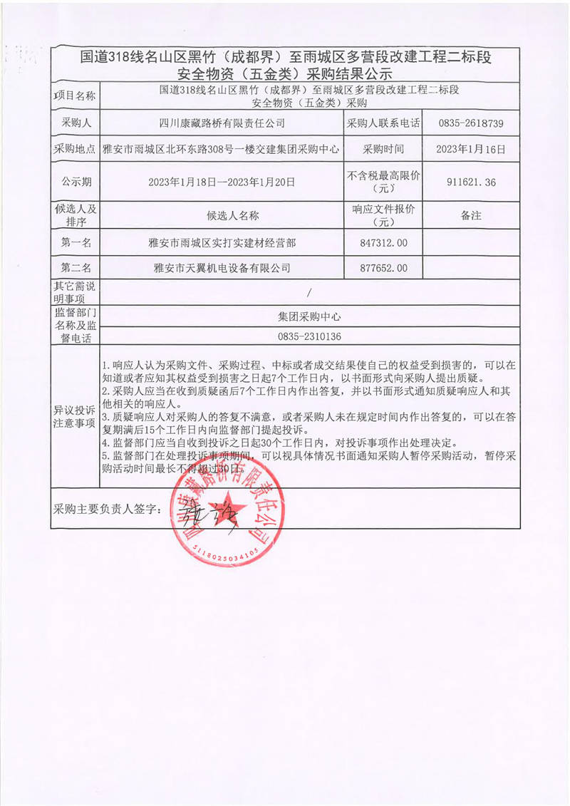 四川康藏路橋有限責(zé)任公司國道318線名山區(qū)黑竹(成都界)至雨城區(qū)多營段改建工程二標段安全物資(五金類)采購結(jié)果公示