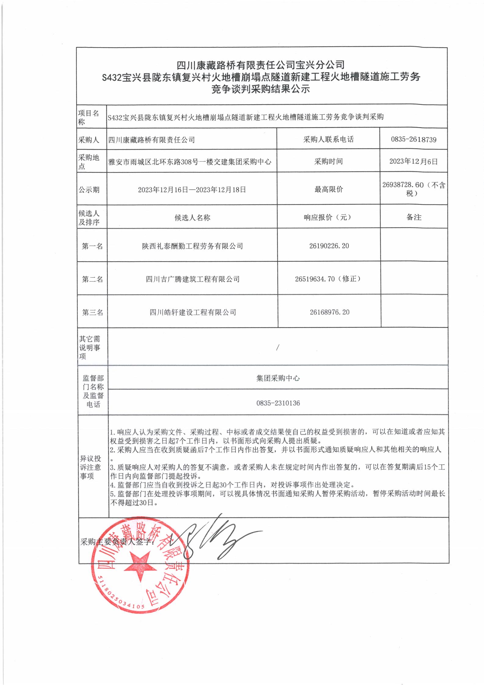 四川康藏路橋有限責任公司寶興分公司S432寶興縣隴東鎮(zhèn)復(fù)興村火地槽崩塌點隧道新建工程火地槽隧道施工勞務(wù)競爭談判采購結(jié)果公示