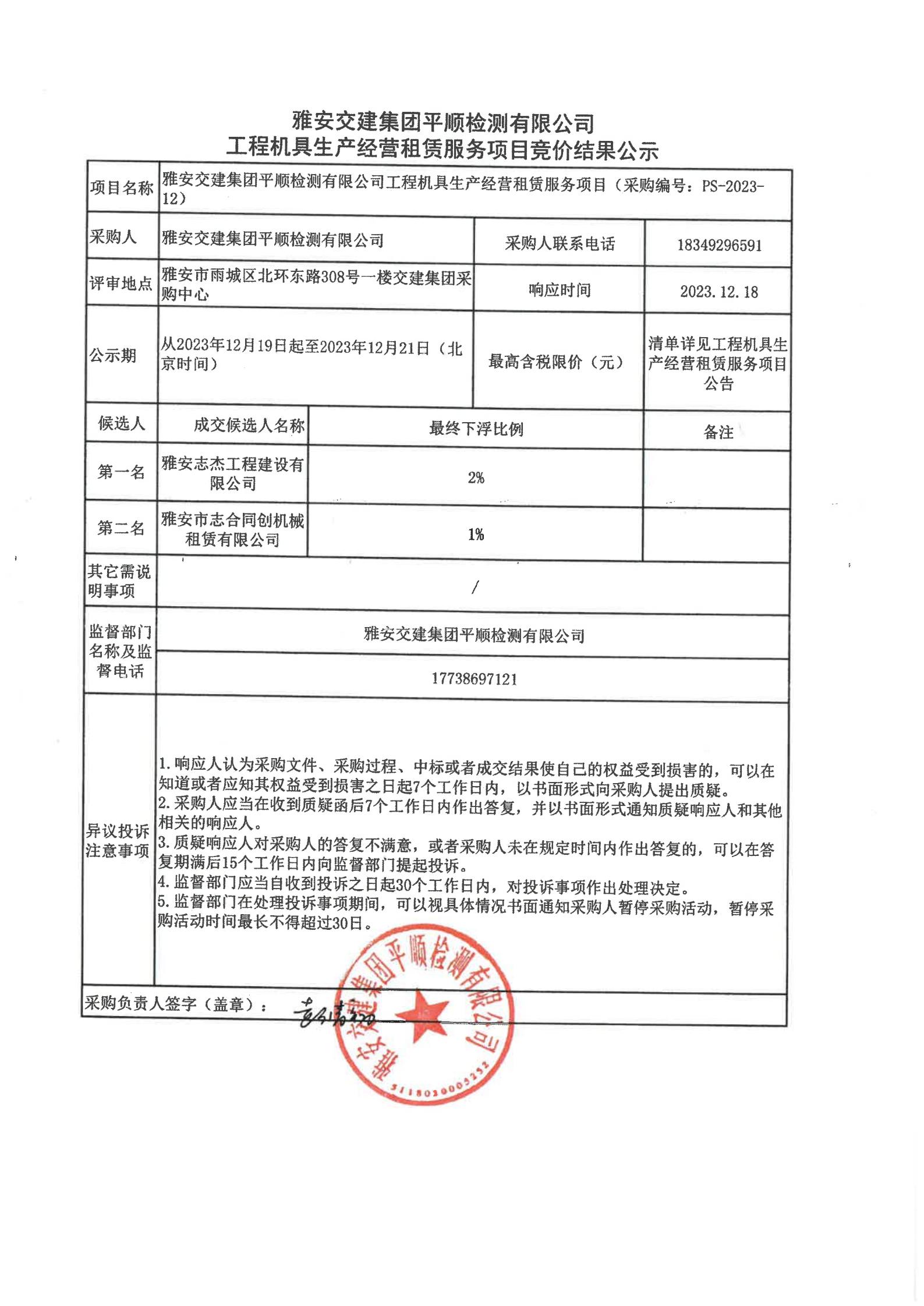 雅安交建集團(tuán)平順檢測有限公司工程機(jī)具生產(chǎn)經(jīng)營租賃服務(wù)項(xiàng)目競價結(jié)果公示