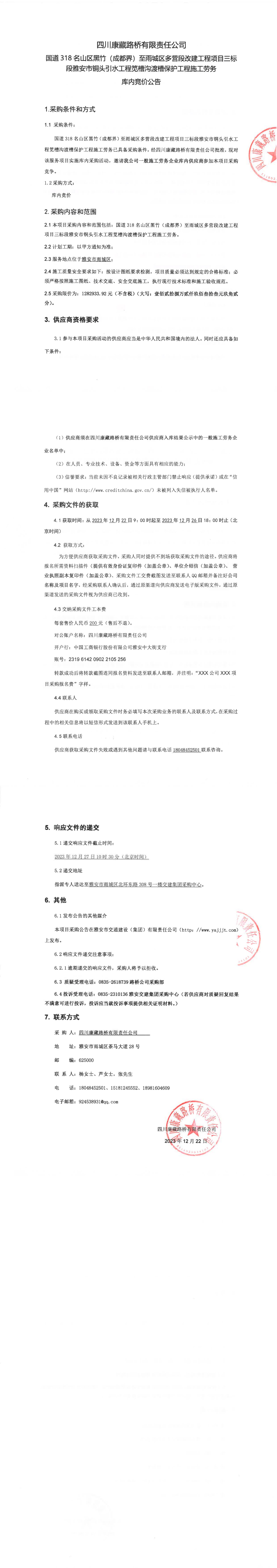 四川康藏路橋有限責任公司國道318名山區(qū)黑竹(成都界)至雨城區(qū)多營段改建工程項目三標段雅安市銅頭引水工程筧槽溝渡槽保護工程施工勞務(wù)庫內(nèi)競價公告
