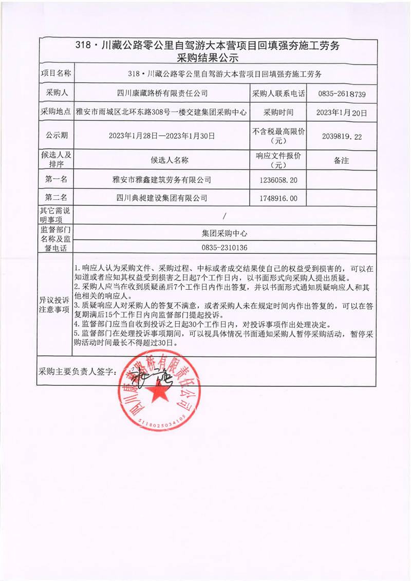 四川康藏路橋有限責(zé)任公司S431蘆山縣龍門至雙石段改建工程項目邊坡防護(hù)工程施工勞務(wù)采購競爭談判結(jié)果公示