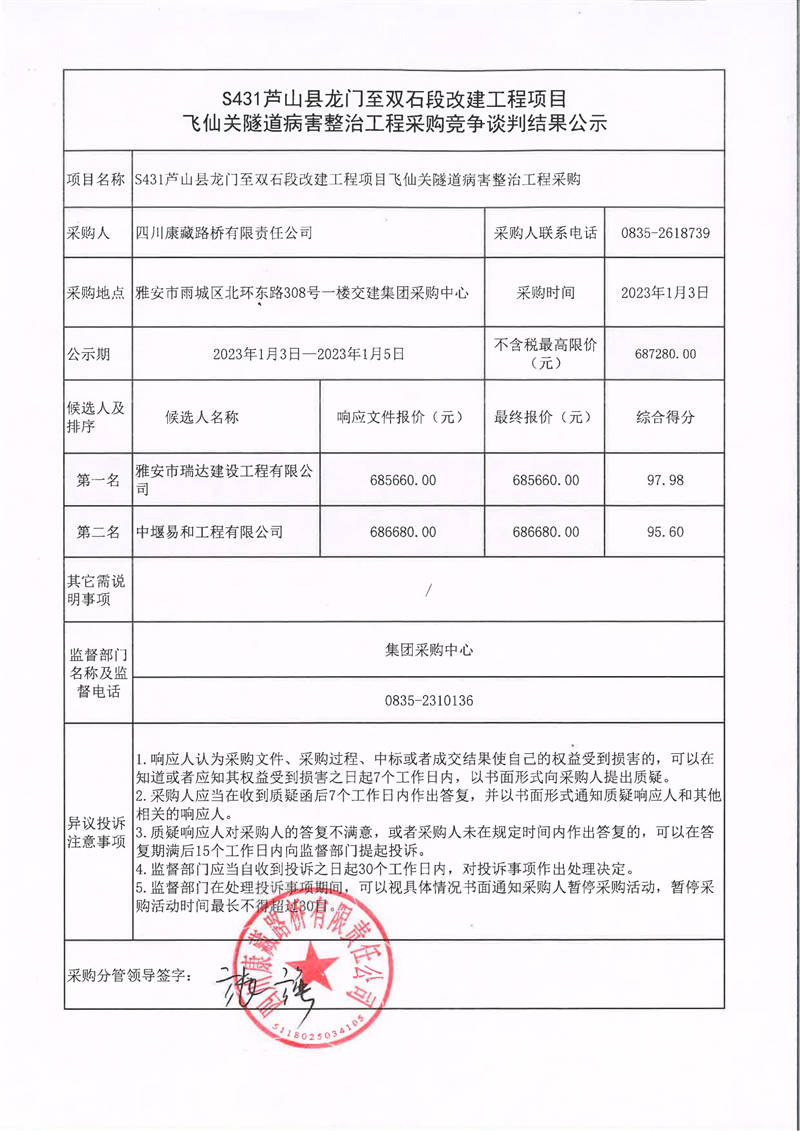 四川康藏路橋有限責任公司S431蘆山縣龍門至雙石段改建工程項目飛仙關隧道病害整治工程采購競爭談判結果公示