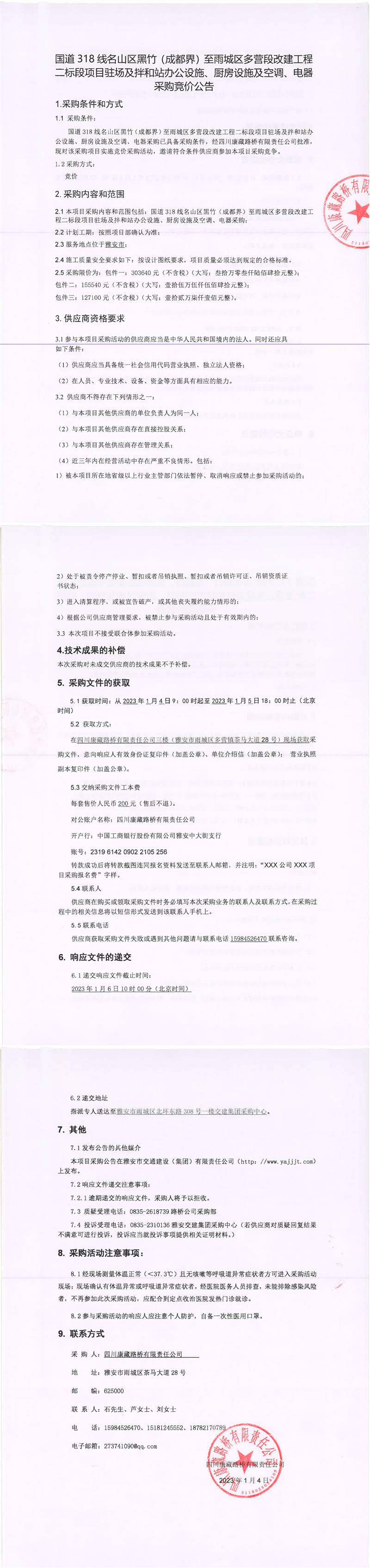 四川康藏路橋有限責任公司國道318線名山區(qū)黑竹(成都界)至雨城區(qū)多營段改建工程二標段項目駐場及拌和站辦公設(shè)施、廚房設(shè)施及空調(diào)、電器采購競價公告