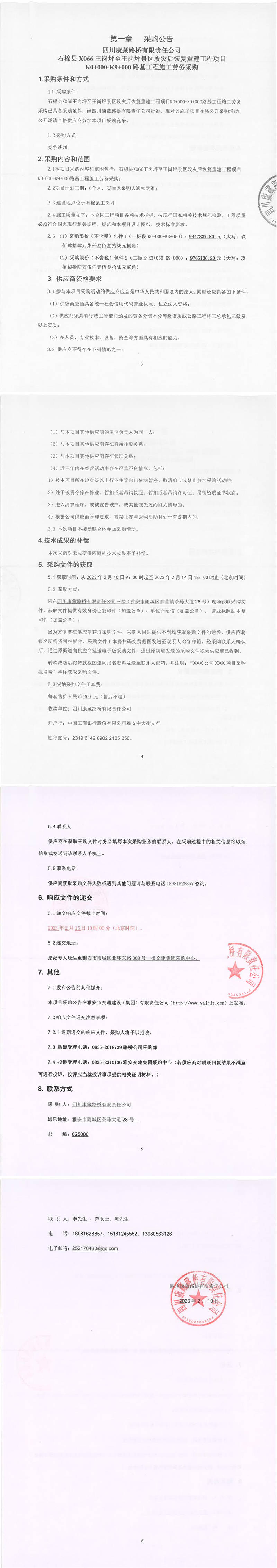四川康藏路橋有限責(zé)任公司石棉縣X066王崗坪至王崗坪景區(qū)段災(zāi)后恢復(fù)重建工程項目K0+000-K9+000路基工程施工勞務(wù)采購采購公告