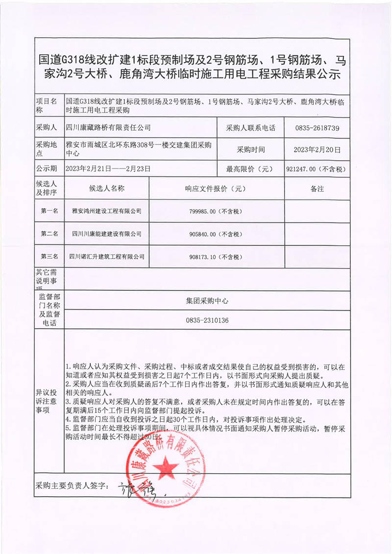 四川康藏路橋有限責(zé)任公司國(guó)道318線改擴(kuò)建1標(biāo)段預(yù)制場(chǎng)及2號(hào)鋼筋場(chǎng)、1號(hào)鋼筋場(chǎng)、馬家溝2號(hào)大橋、鹿角灣大橋臨時(shí)施工用電工程采購(gòu)結(jié)果公示