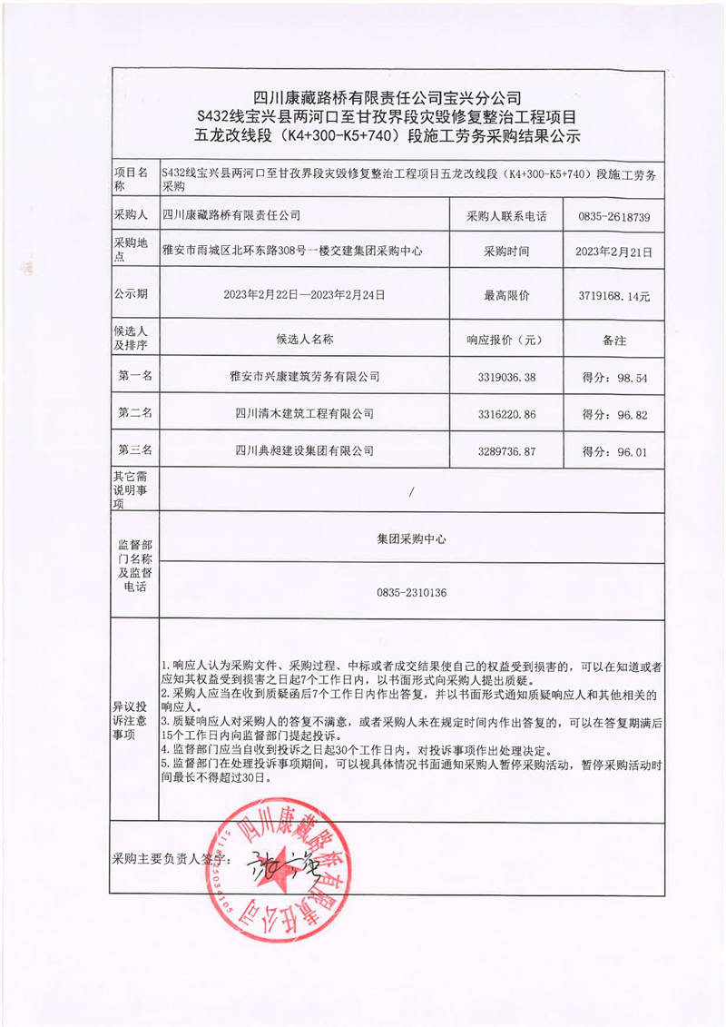 四川康藏路橋有限責任公司寶興分公司S432寶興縣兩河口至甘孜界段災毀修復整治工程項目五龍改線段(K4+300-K5+740)段施工勞務采購結(jié)果公示