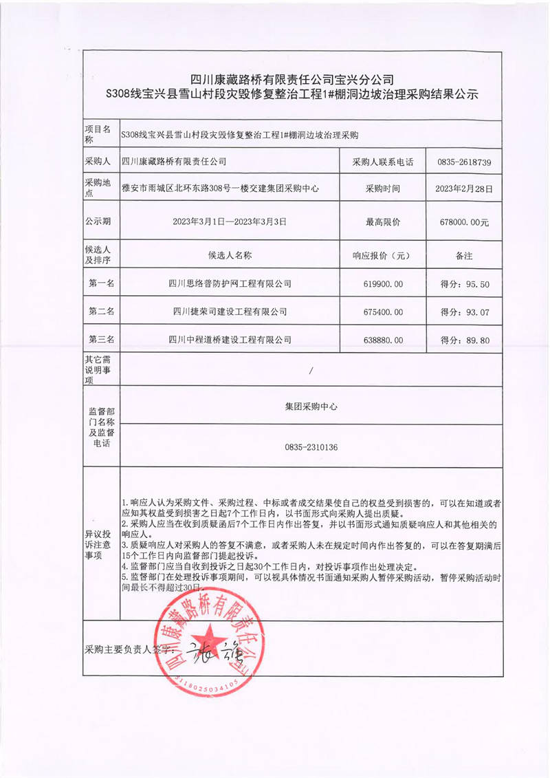四川康藏路橋有限責任公司寶興分公司S308線寶興縣雪山村段災毀修復整治工程1#棚洞邊坡治理采購結果公示