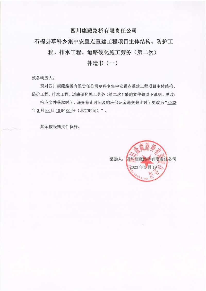四川康藏路橋有限責(zé)任公司石棉縣草科鄉(xiāng)集中安置點(diǎn)重建工程項目主體結(jié)構(gòu)、防護(hù)工程、排水工程、道路硬化施工勞務(wù)(第二次)補(bǔ)遺書(一)