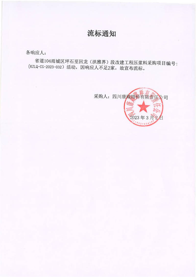 四川康藏路橋有限責(zé)任公司省道104雨城區(qū)坪石至回龍(洪雅界)段改建工程壓漿料采購(gòu)流標(biāo)通知