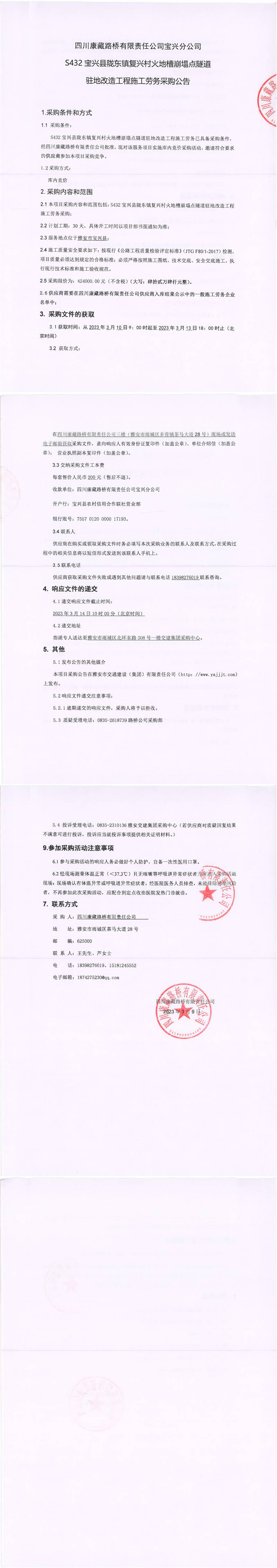 四川康藏路橋有限責(zé)任公司寶興分公司S432寶興縣隴東鎮(zhèn)復(fù)興村火地槽崩塌點(diǎn)隧道駐地改造工程施工勞務(wù)采購公告