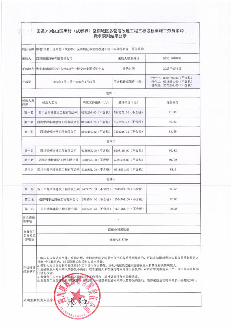四川康藏路橋有限責任公司國道318名山區(qū)黑竹(成都界)至雨城區(qū)多營段改建工程三標段橋梁施工勞務采購競爭談判結果公示