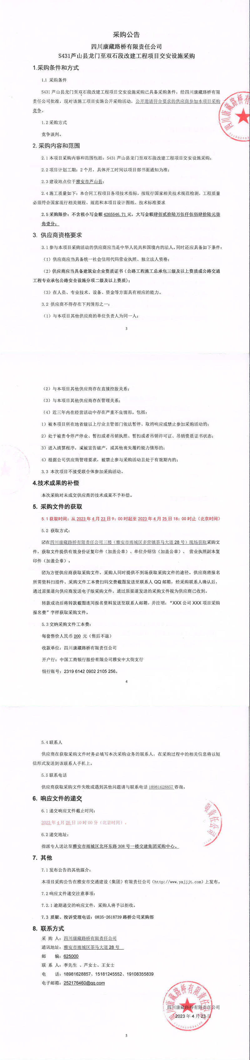 四川康藏路橋有限責任公司S431蘆山縣龍門至雙石段改建工程項目交安設施采購