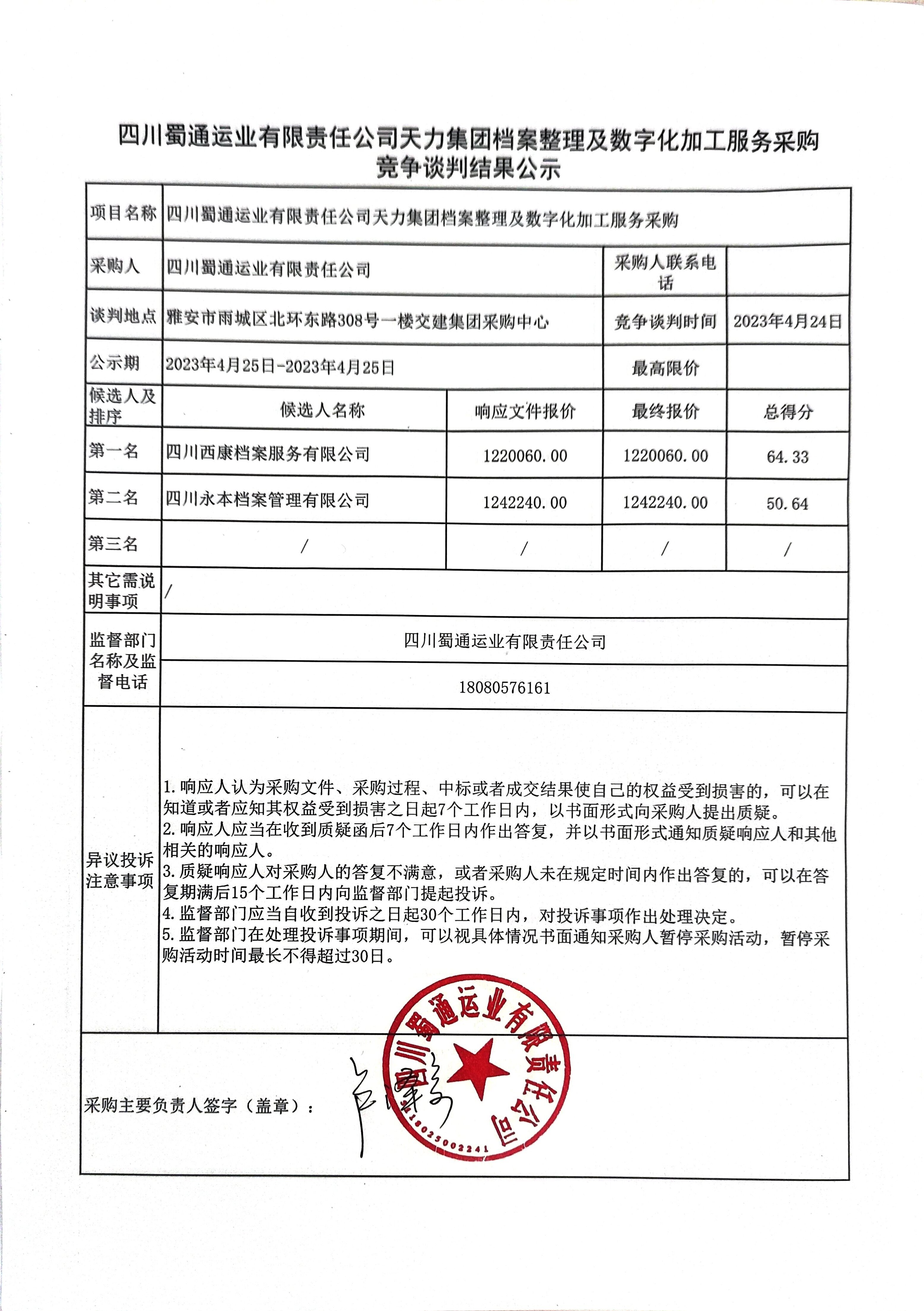四川蜀通運業(yè)有限責任公司天力集團檔案整理及數字化加工服務采購競爭談判結果公示