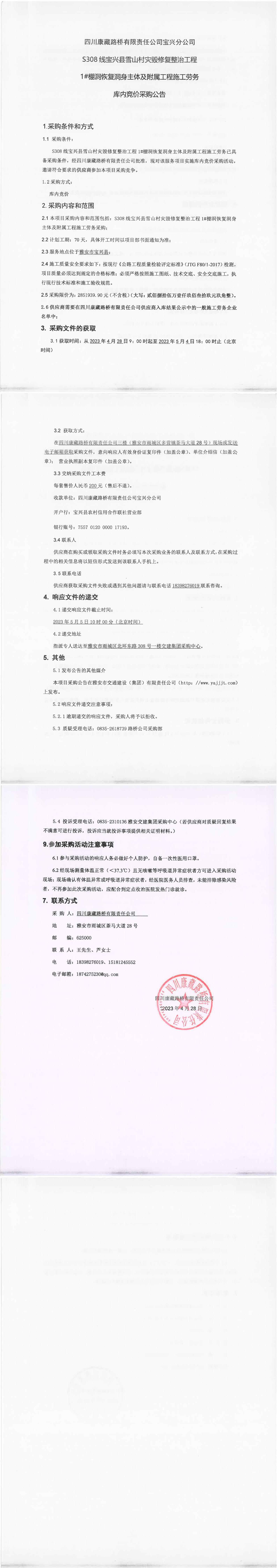 四川康藏路橋有限責任公司寶興分公司S308線寶興縣雪山村段災毀修復整治工程1#棚洞恢復洞身主體及附屬工程施工勞務庫內(nèi)競價采購公告