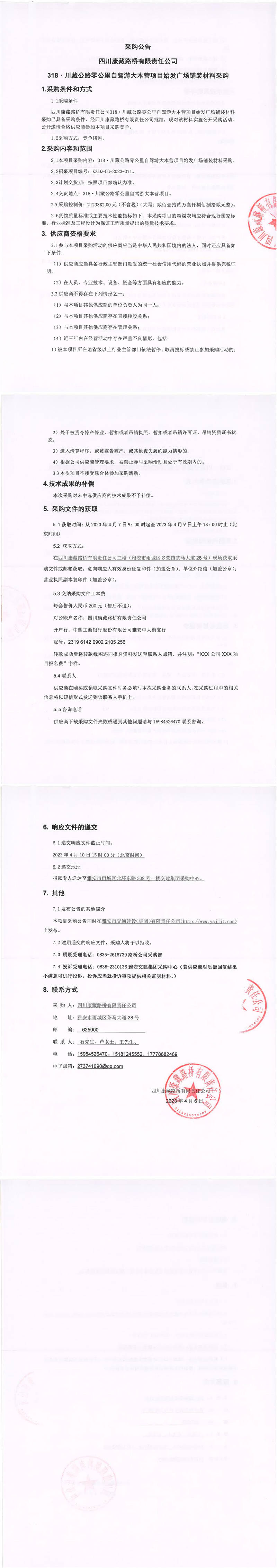 四川康藏路橋有限責(zé)任公司318·川藏公路零公里自駕游大本營項(xiàng)目始發(fā)廣場(chǎng)鋪裝材料采購公告