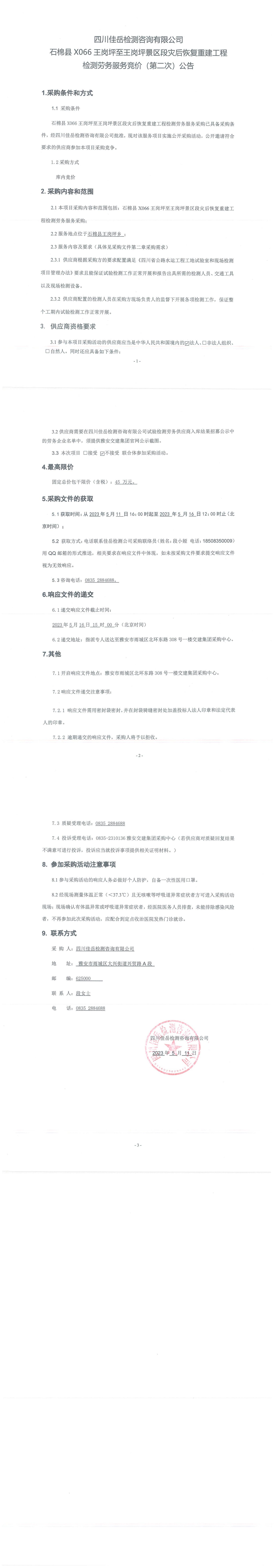 四川佳岳檢測咨詢有限公司石棉縣X066王崗坪至王崗坪景區(qū)段災(zāi)后恢復(fù)重建工程檢測勞務(wù)服務(wù)競價(jià)(第二次)采購公告
