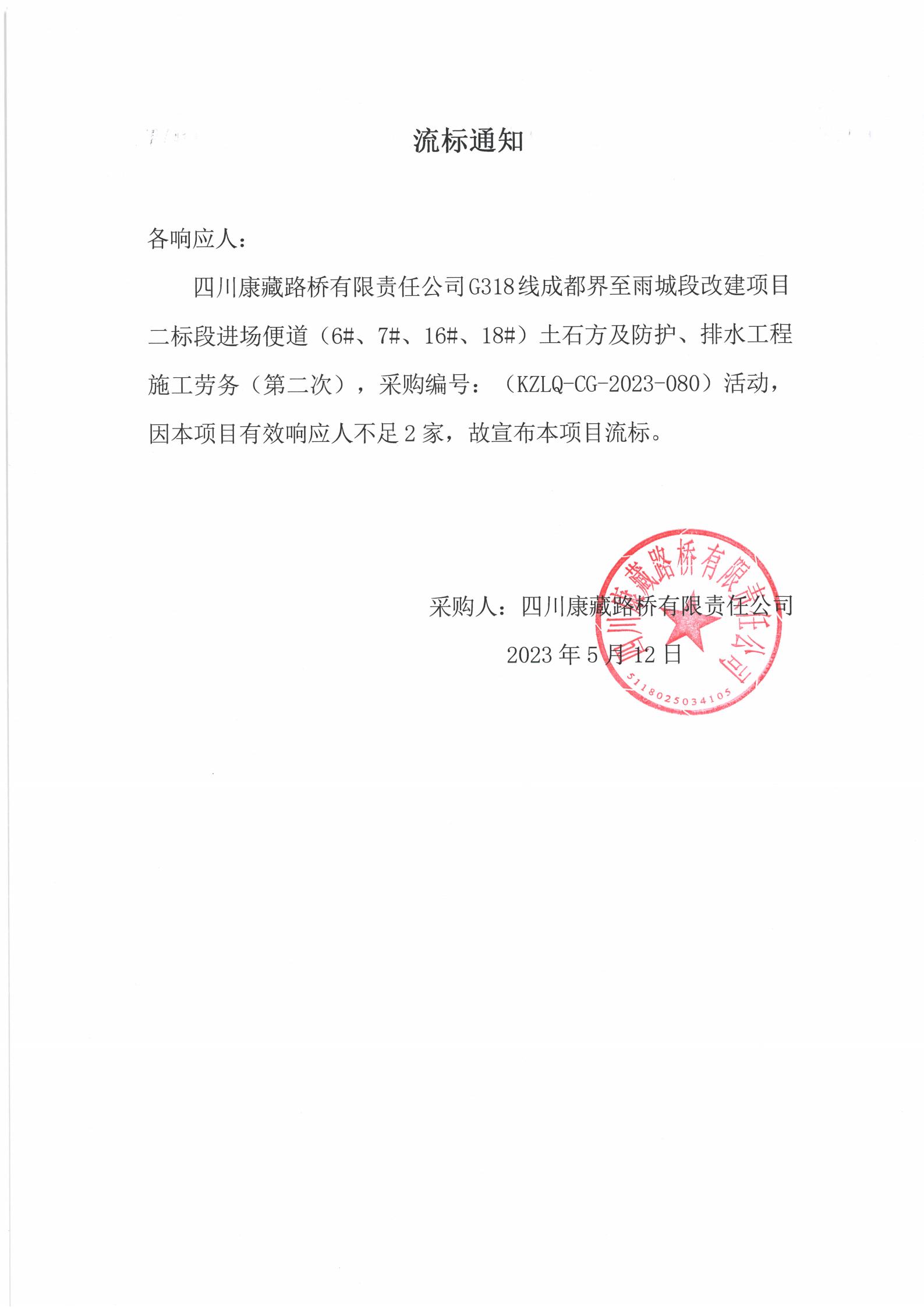 四川康藏路橋有限責任公司G318線成都至雨城段改建項目二標段進場便道(6#、7#、16#、18#)土石方及防護、排水工程施工勞務(wù)(第二次)流標通知