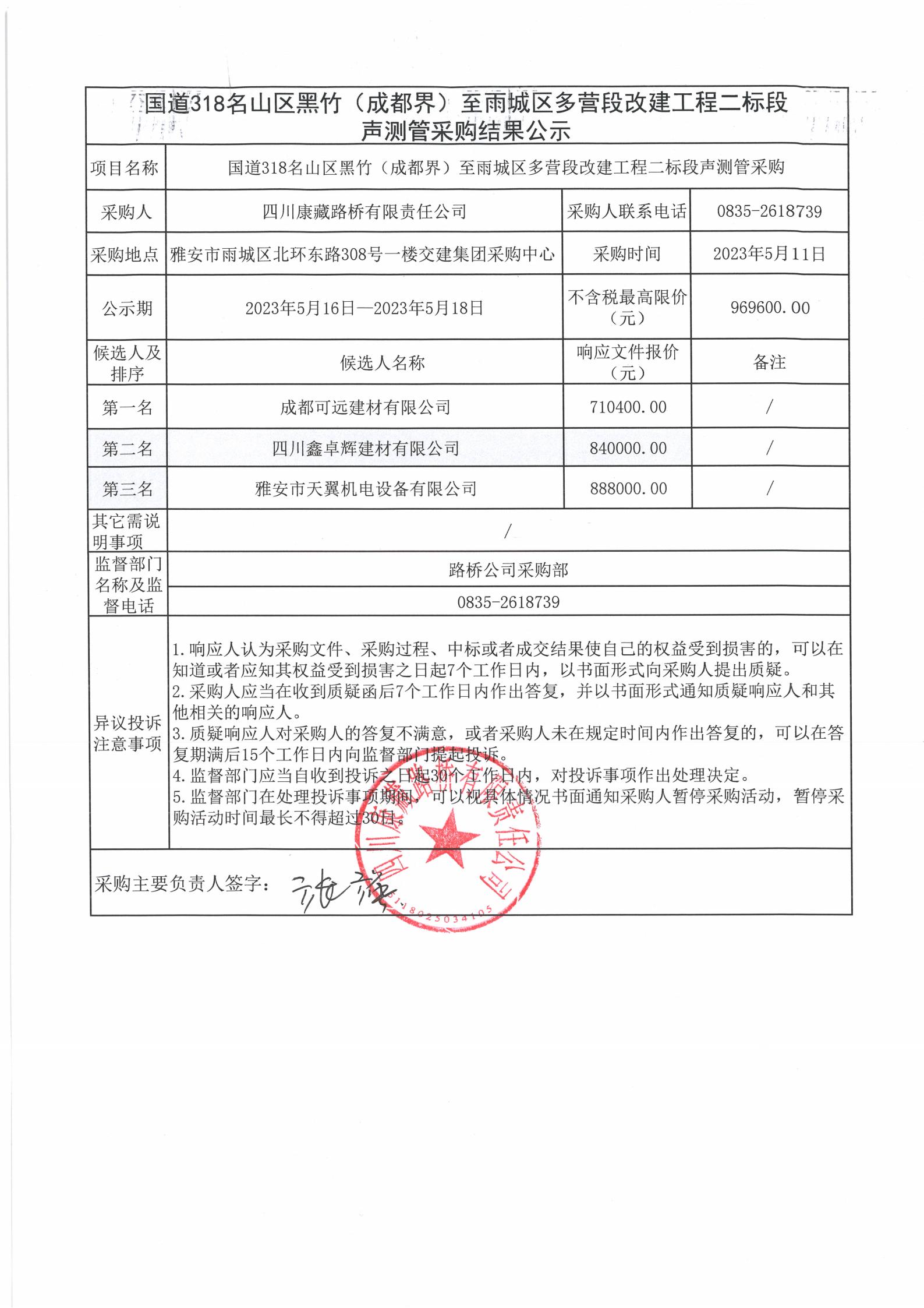 四川康藏路橋有限責(zé)任公司國(guó)道318名山區(qū)黑竹(成都界)至雨城區(qū)多營(yíng)段改建工程二標(biāo)段聲測(cè)管采購(gòu)結(jié)果公示