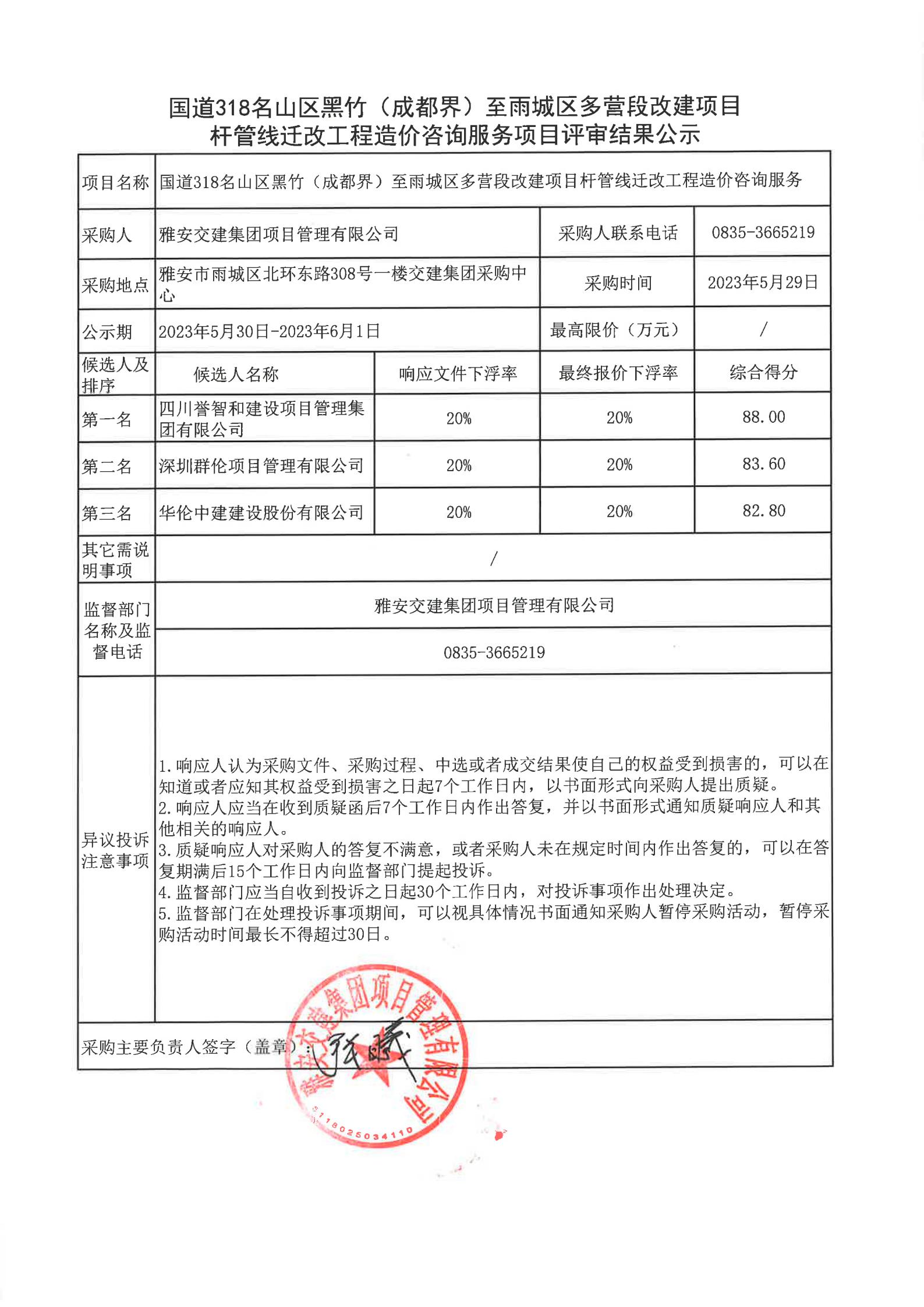 雅安交建集團項目管理有限公司國道318名山區(qū)黑竹(成都界)至雨城區(qū)多營段改建項目桿管線遷改工程造價咨詢服務(wù)項目評審結(jié)果公示