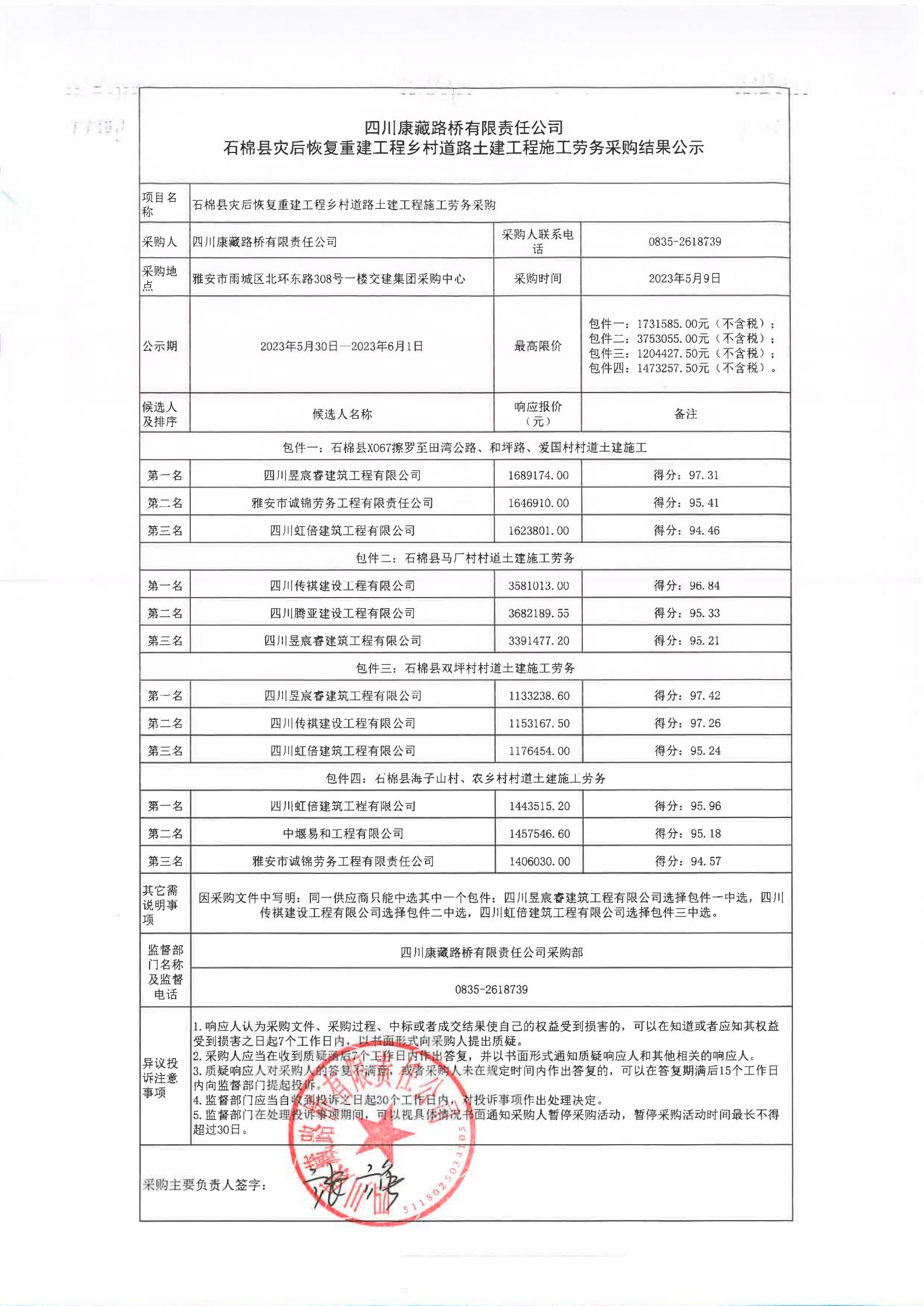 四川康藏路橋有限責任公司石棉縣災后恢復重建工程鄉(xiāng)村道路土建工程施工勞務采購結果公示