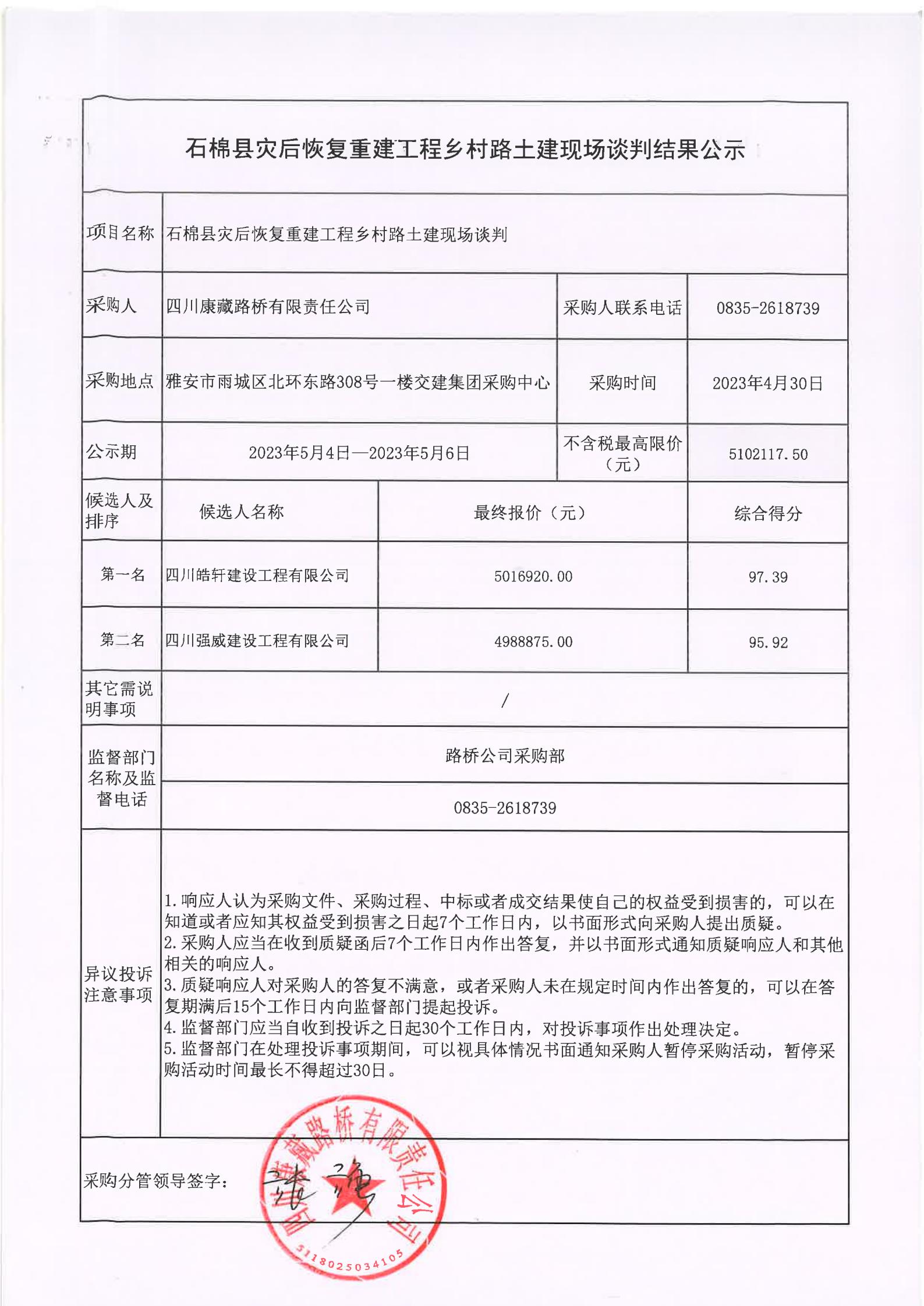 四川康藏路橋有限責任公司石棉縣災后恢復重建工程鄉(xiāng)村路土建現(xiàn)場談判結果公示