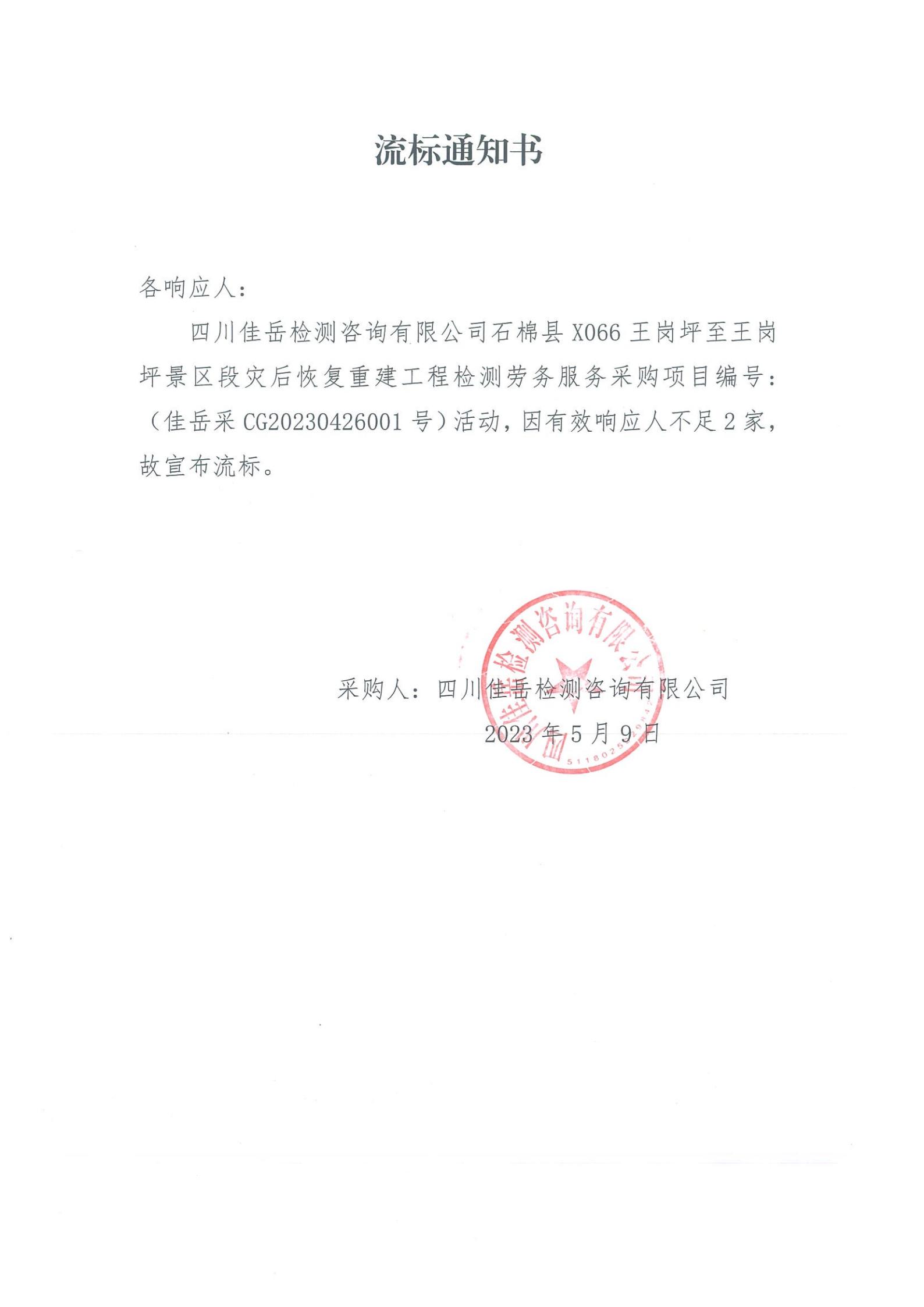 四川佳岳檢測咨詢有限公司石棉縣X066王崗坪至王崗坪景區(qū)段災后恢復重建工程檢測勞務(wù)服務(wù)流標通知