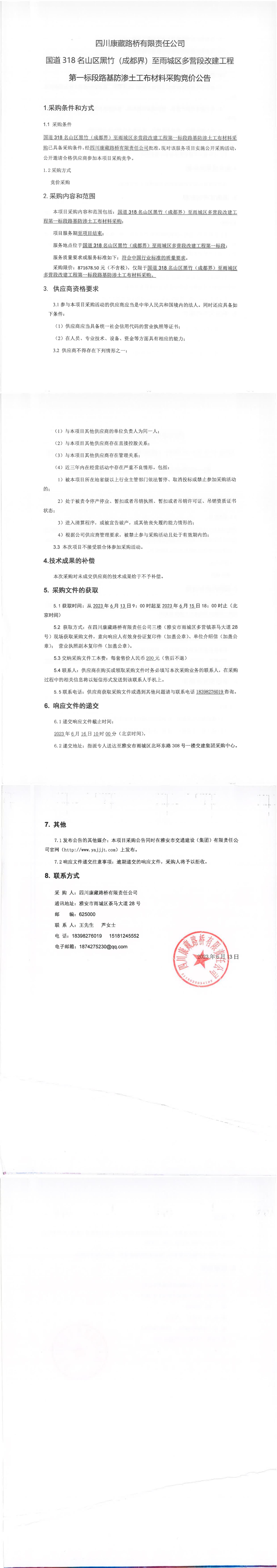 四川康藏路橋有限責(zé)任公司國道318名山區(qū)黑竹(成都界)至雨城區(qū)多營段改建工程第一標(biāo)段路基防滲土工布材料采購競價公告