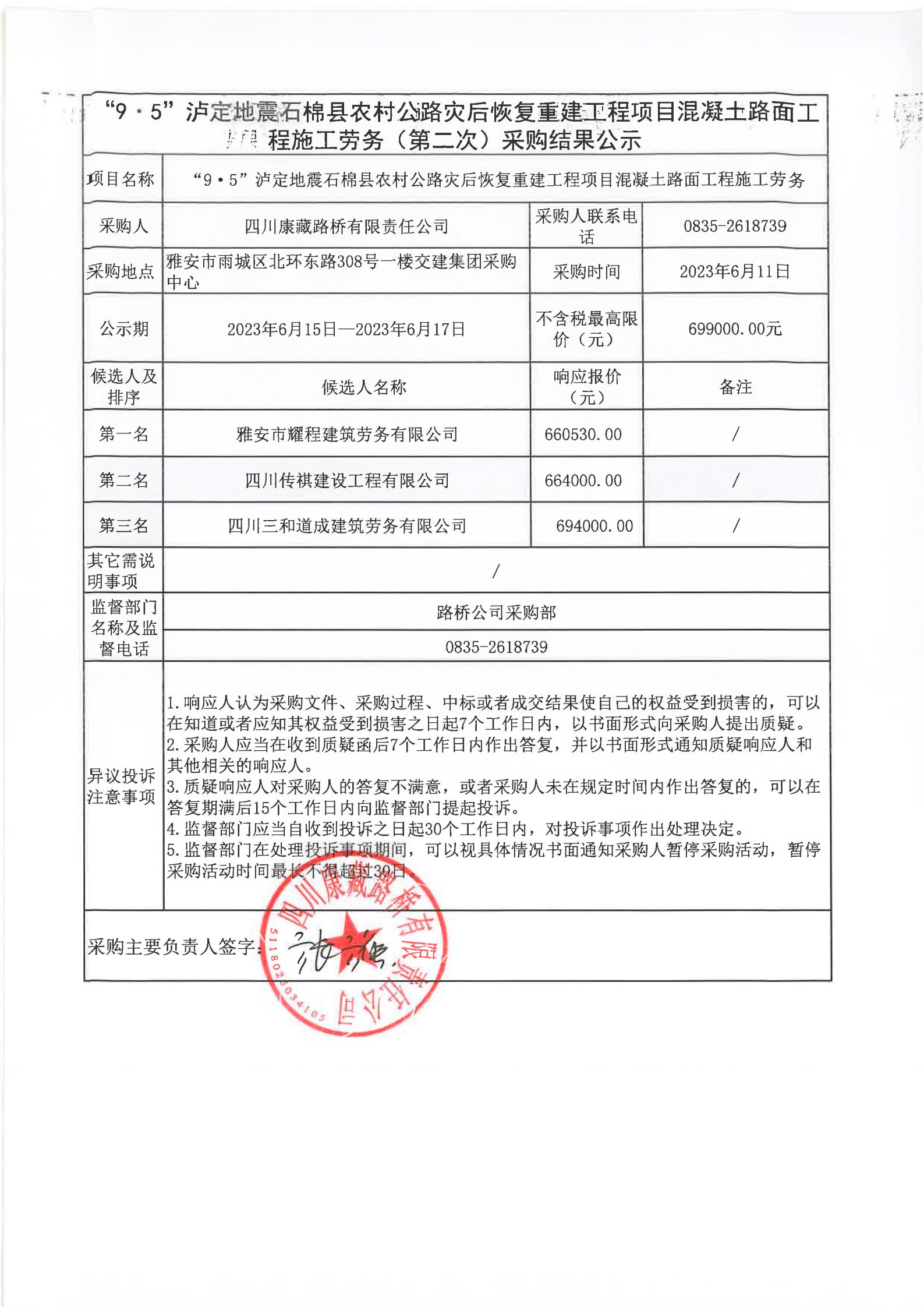 四川康藏路橋有限責任公司“9·5”瀘定地震石棉縣農村公路災后恢復重建工程項目混凝土路面工程施工勞務采購(第二次)結果公示
