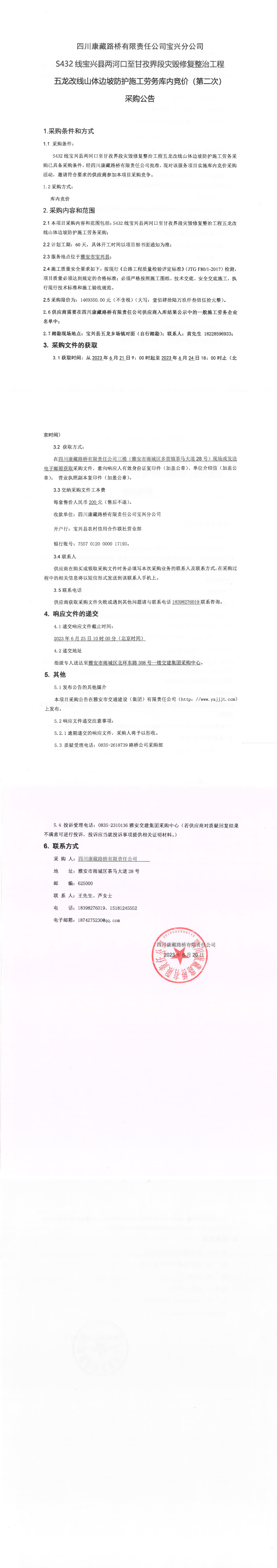 四川康藏路橋有限責(zé)任公司寶興分公司S432線寶興縣兩河口至甘孜界段災(zāi)毀修復(fù)整治工程五龍改線山體邊坡防護施工勞務(wù)庫內(nèi)競價(第二次)采購公告