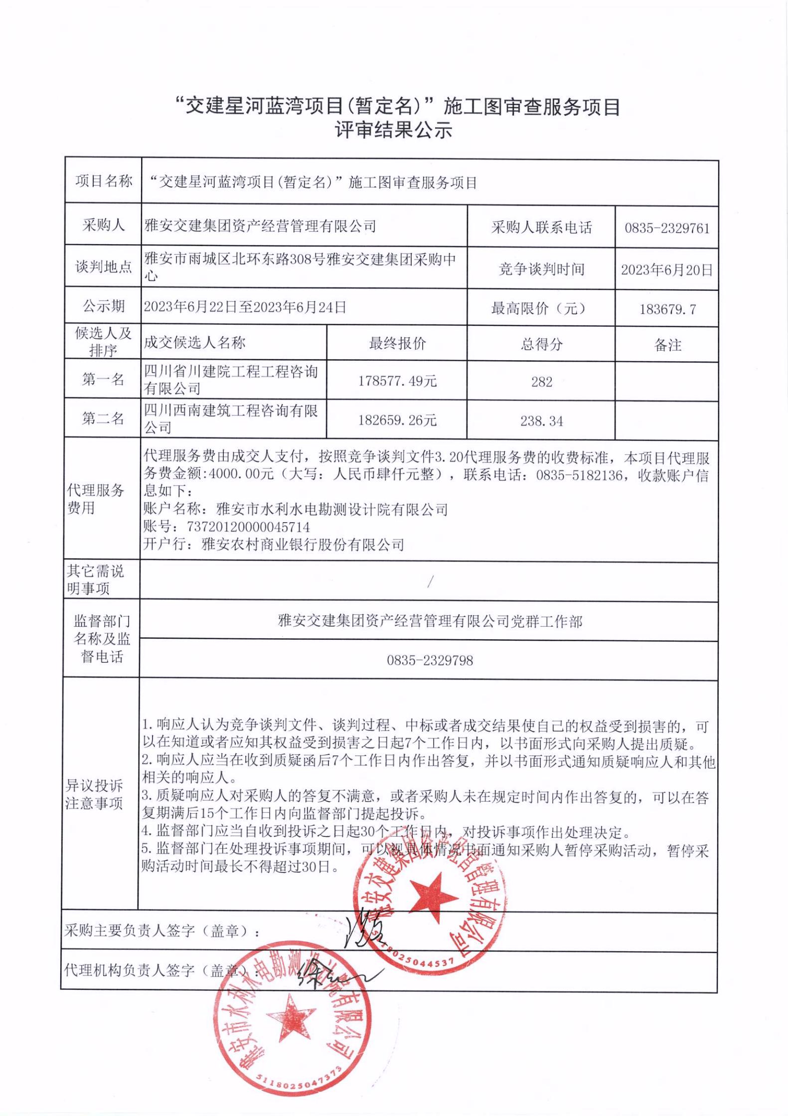 雅安交建集團(tuán)資產(chǎn)經(jīng)營管理有限公司“交建星河藍(lán)灣項目(暫定名)”施工圖審查服務(wù)項目評審結(jié)果公示