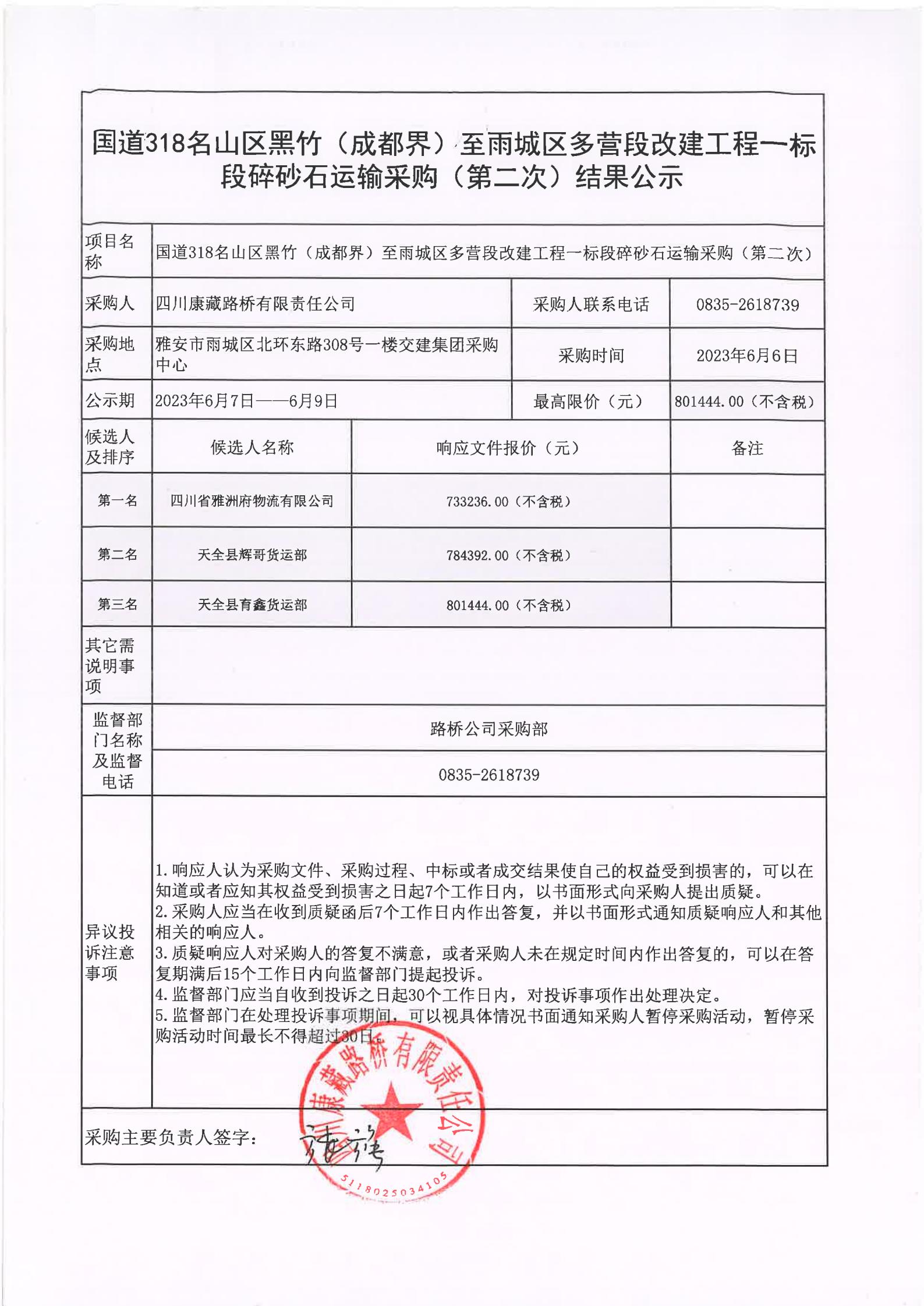 四川康藏路橋有限責任公司國道318名山區(qū)黑竹(成都界)至雨城區(qū)多營段改建工程一標段碎砂石運輸采購(第二次)結(jié)果公示