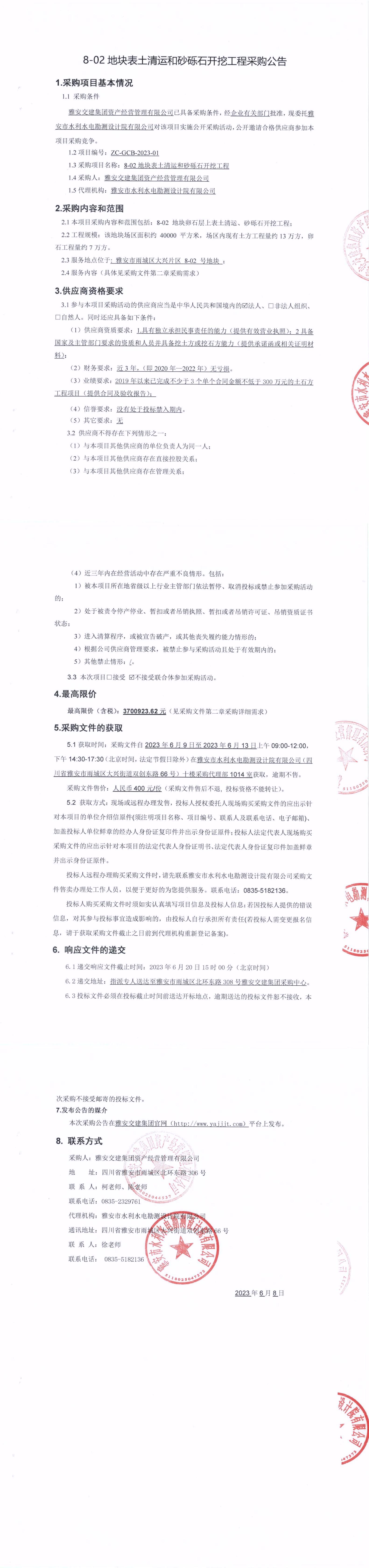 雅安交建集團資產經(jīng)營管理有限公司8-02地塊表土清運和砂礫石開挖工程采購公告