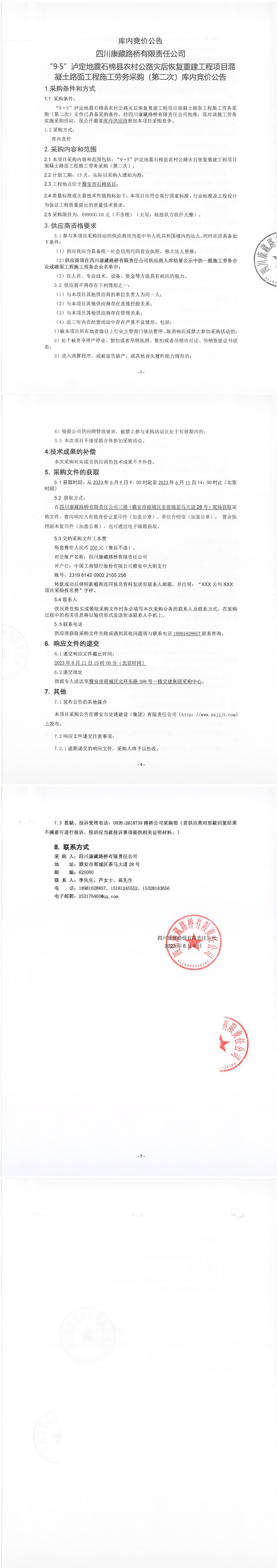 四川康藏路橋有限責任公司“9·5”瀘定地震石棉縣農(nóng)村公路災(zāi)后恢復(fù)重建工程項目混凝土路面工程施工勞務(wù)采購(第二次)庫內(nèi)競價公告