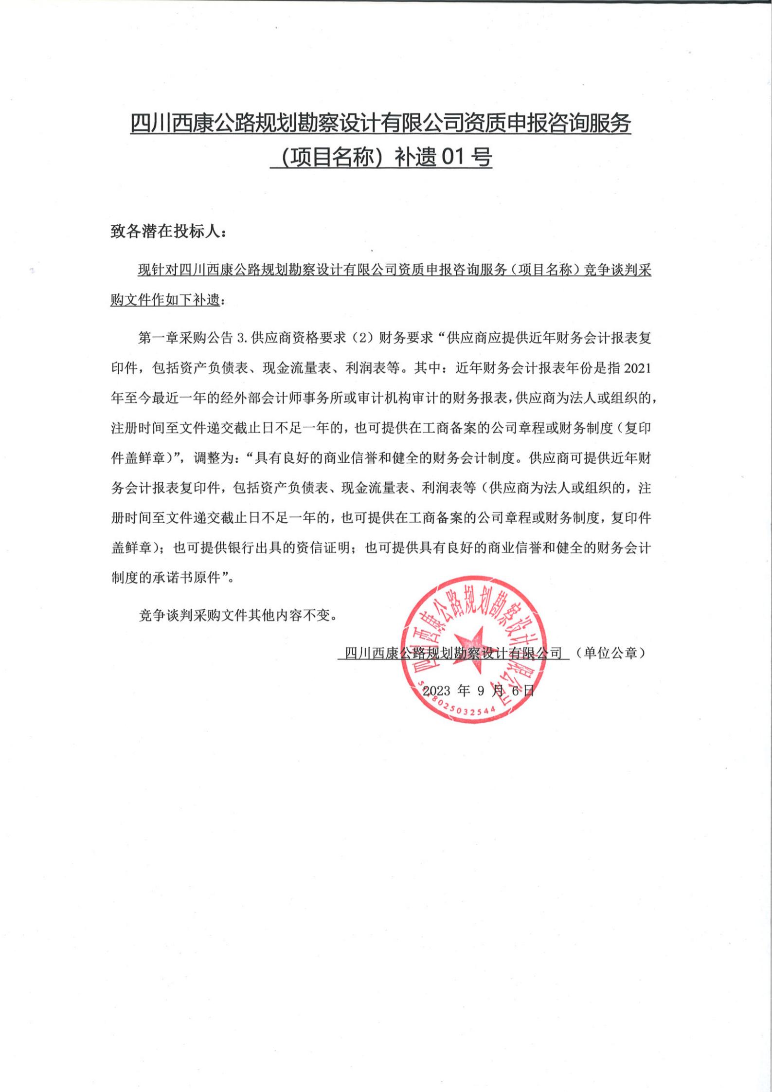 四川西康公路規(guī)劃勘察設(shè)計有限公司資質(zhì)申報咨詢服務(wù)(項目名稱)補(bǔ)遺01號