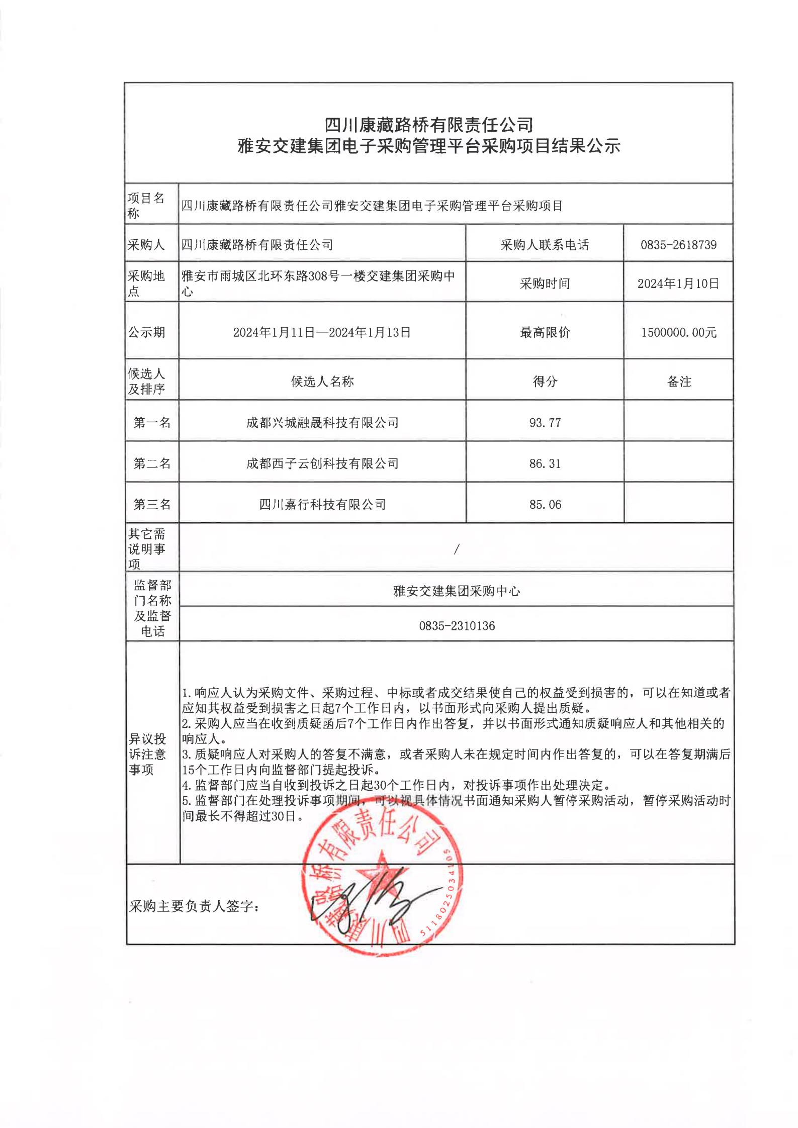 四川康藏路橋有限責(zé)任公司雅安交建集團電子采購管理平臺采購項目結(jié)果公示