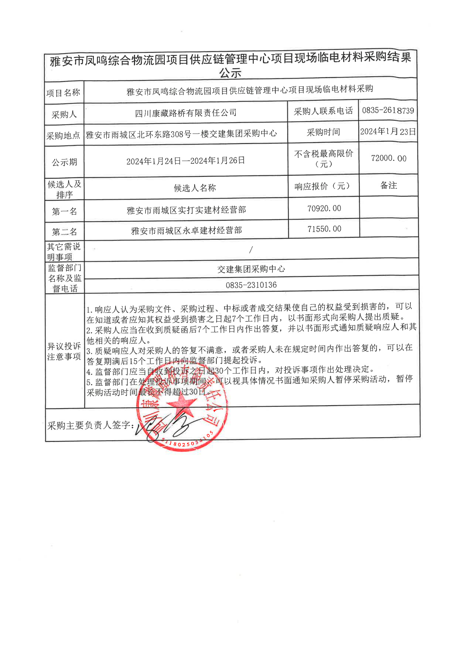 四川康藏路橋有限責(zé)任公司雅安市鳳鳴綜合物流園項目供應(yīng)鏈管理中心項目現(xiàn)場臨電材料采購結(jié)果公示