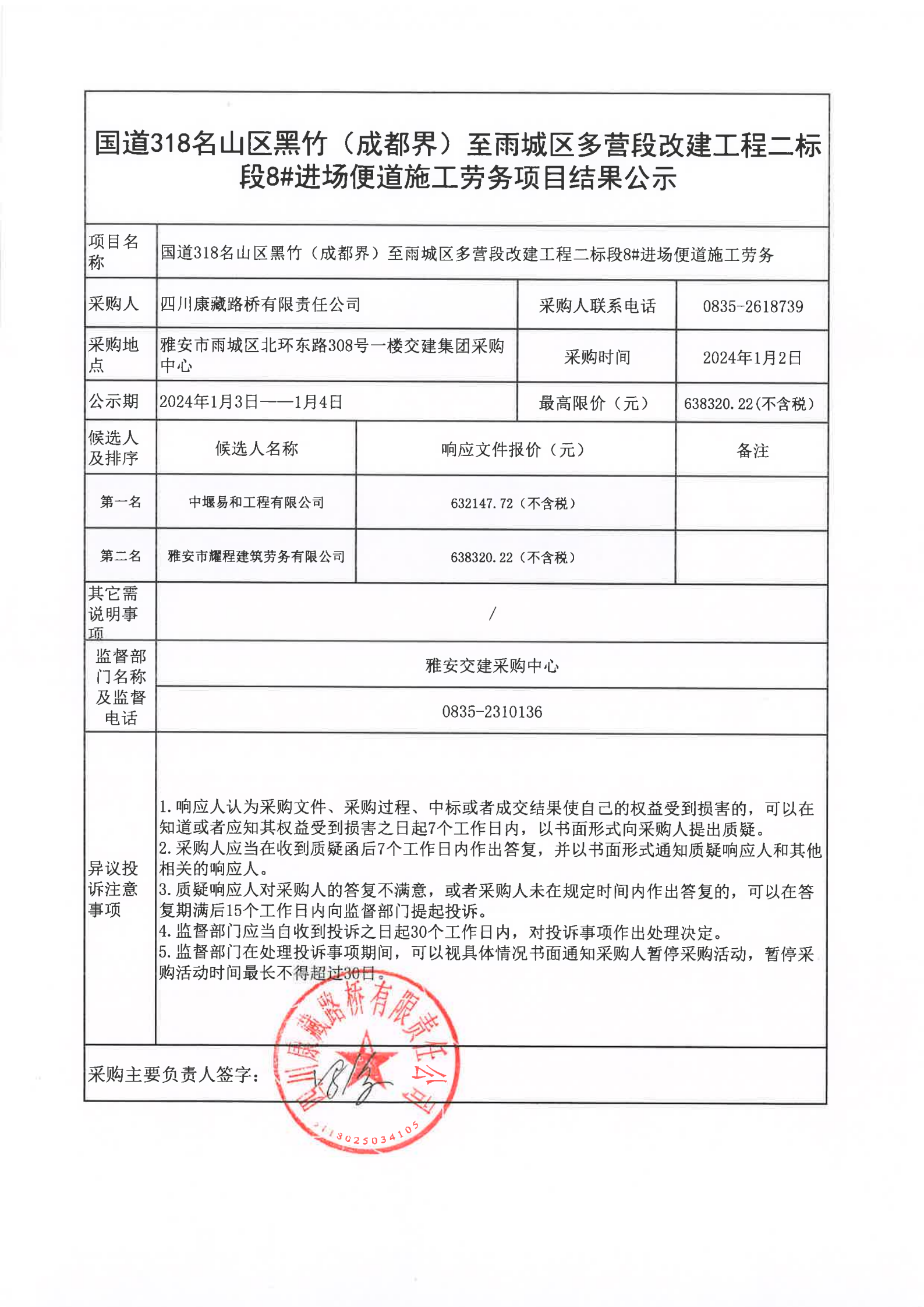 四川康藏路橋有限責(zé)任公司國道318名山區(qū)黑竹(成都界)至雨城區(qū)多營段改建工程二標(biāo)段8#進(jìn)場便道施工勞務(wù)項(xiàng)目結(jié)果公示