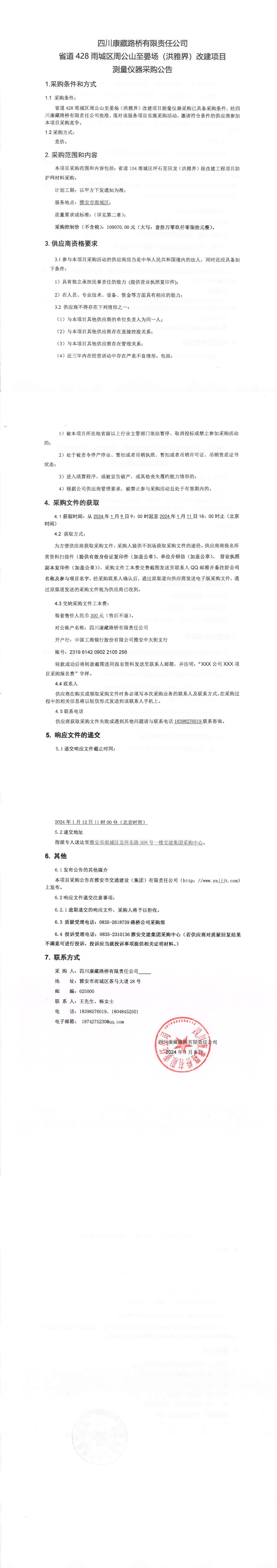 四川康藏路橋有限責(zé)任公司省道428雨城區(qū)周公山至晏場(chǎng)(洪雅界)改建項(xiàng)目測(cè)量?jī)x器采購(gòu)公告