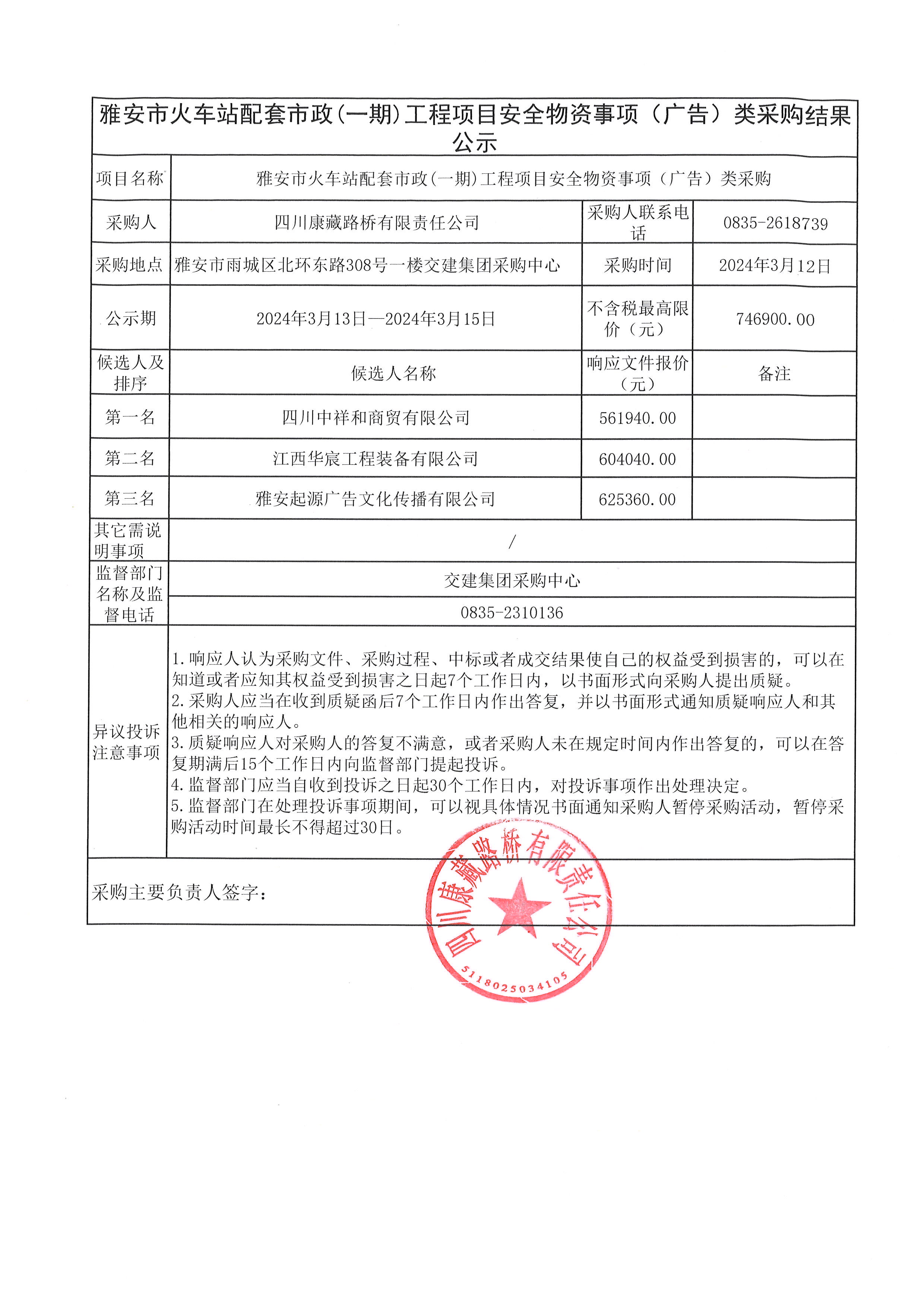 四川康藏路橋有限責(zé)任公司雅安市火車站配套市政(一期)工程項(xiàng)目安全物資(廣告)采購結(jié)果公示