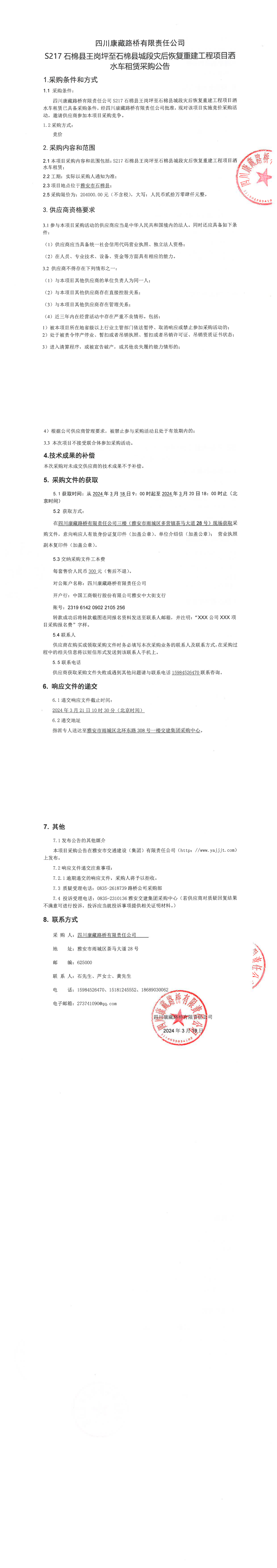 四川康藏路橋有限責任公司S217石棉縣王崗坪至石棉縣城段災(zāi)后恢復(fù)重建工程項目灑水車租賃采購公告