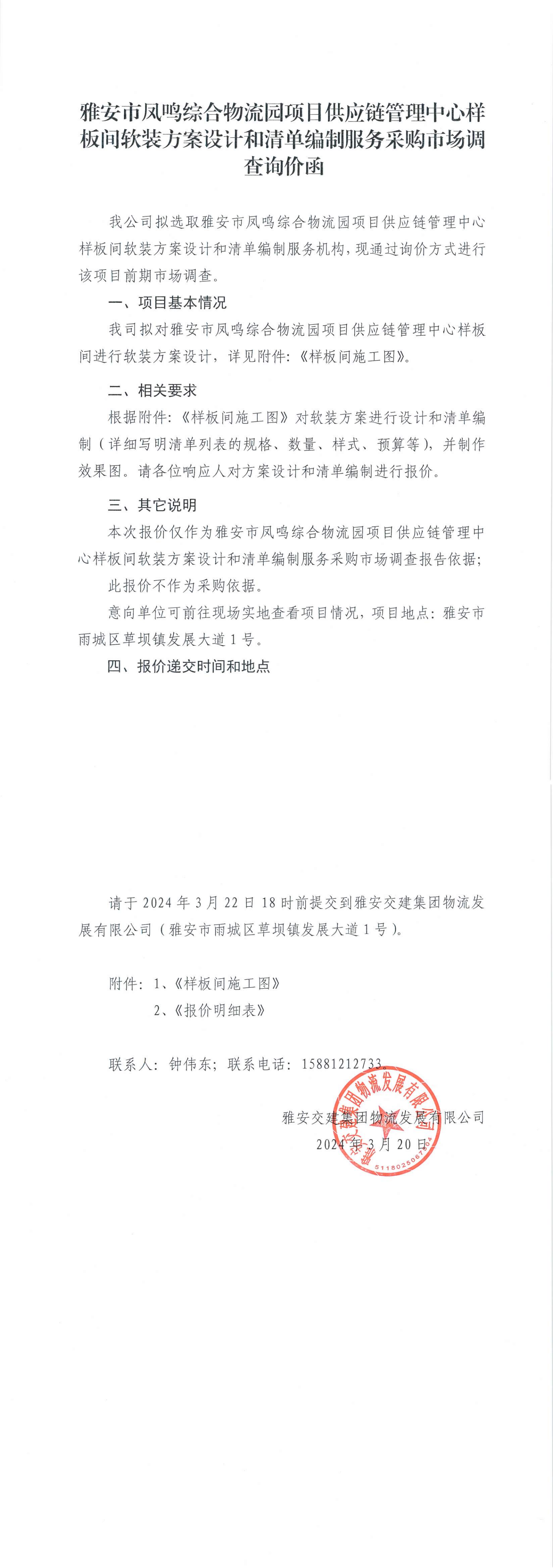 雅安交建集團物流發(fā)展有限公司雅安市鳳鳴綜合物流園項目供應鏈管理中心樣板間軟裝方案設計和清單編制服務采購市場調查詢價函