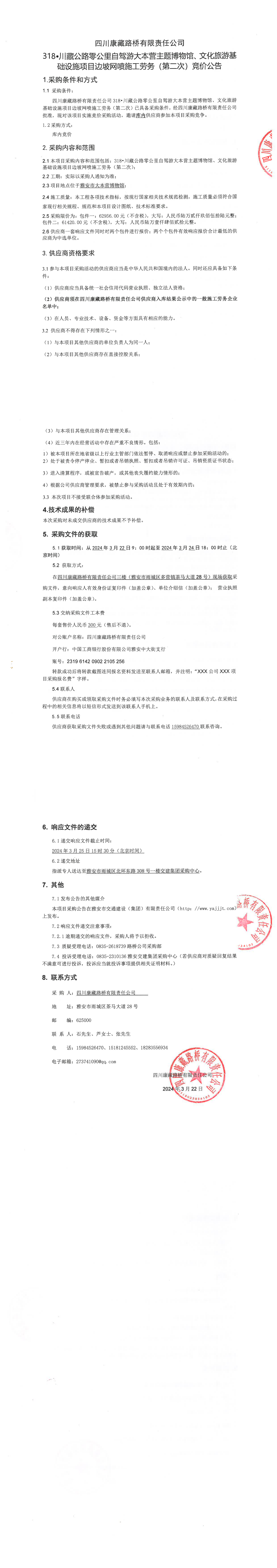 四川康藏路橋有限責(zé)任公司318·川藏公路零公里自駕游大本營主題博物館、文化旅游基礎(chǔ)設(shè)施項目邊坡網(wǎng)噴施工勞務(wù)(第二次)競價公告
