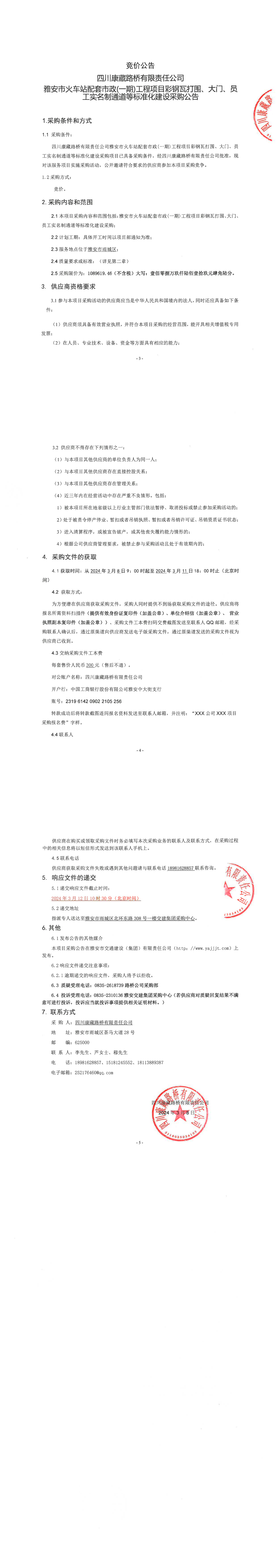 四川康藏路橋有限責(zé)任公司雅安市火車站配套市政(一期)工程項(xiàng)目彩鋼瓦打圍、大門(mén)、員工實(shí)名制通道等標(biāo)準(zhǔn)化建設(shè)采購(gòu)公告
