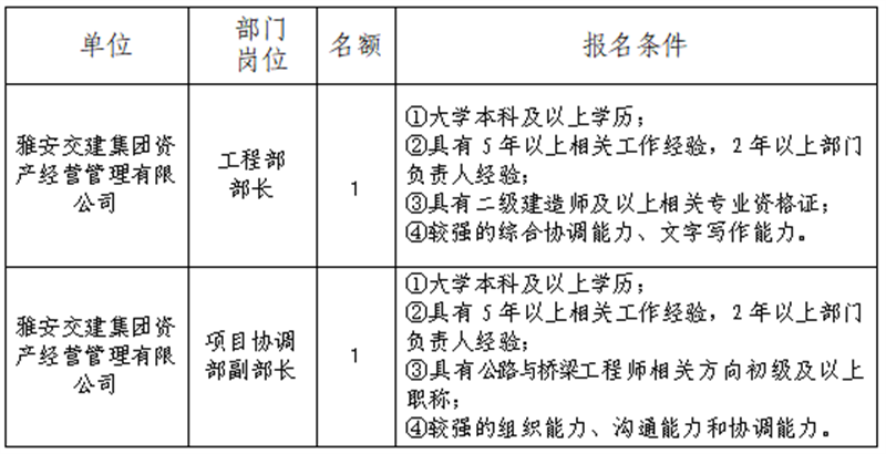 根據發(fā)展需要,決定面向社會公開招聘雅安市交通建設(集團)有限責任公司(以下簡稱“雅安交建集團”)所屬子公司工作人員2名,現(xiàn)將有關事項公告如下: