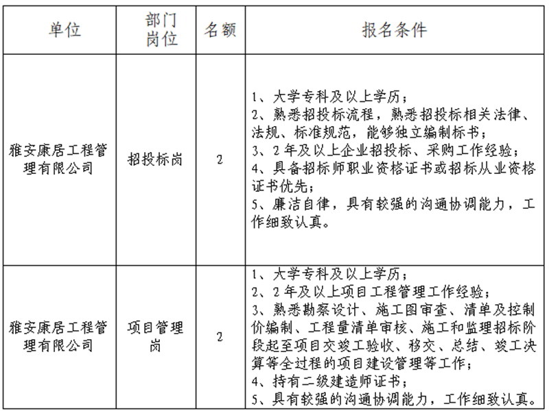 根據(jù)發(fā)展需要,決定面向社會公開招聘雅安市交通建設(shè)(集團)有限責任公司(以下簡稱“雅安交建集團”)所屬子公司工作人員4名,現(xiàn)將有關(guān)事項公告如下: