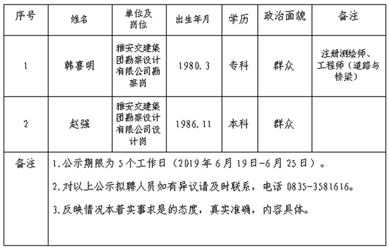 雅安交建集團子公司擬聘用人員公示 (勘察設計公司)