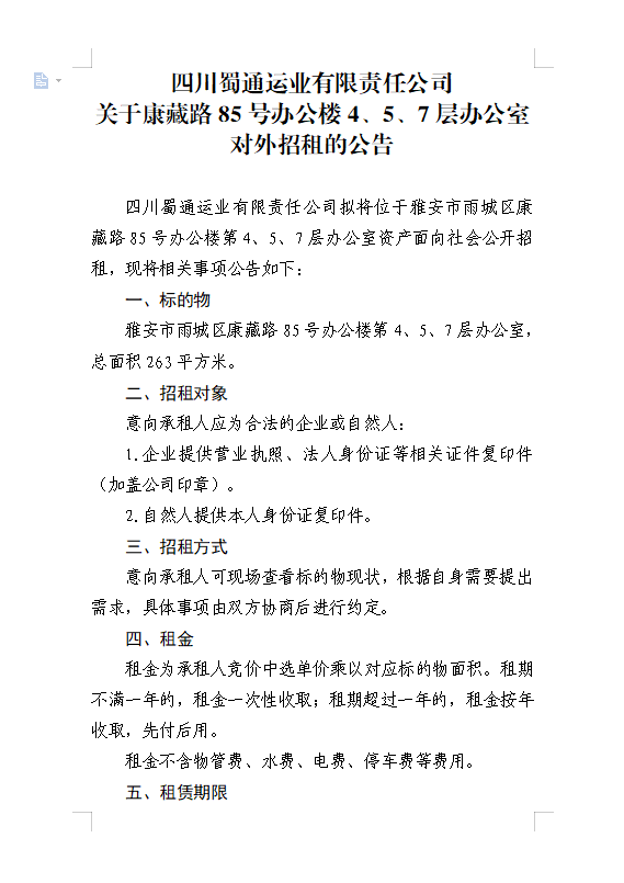 四川蜀通運業(yè)有限責(zé)任公司關(guān)于康藏路85號辦公樓4、5、7樓資產(chǎn)租賃公告