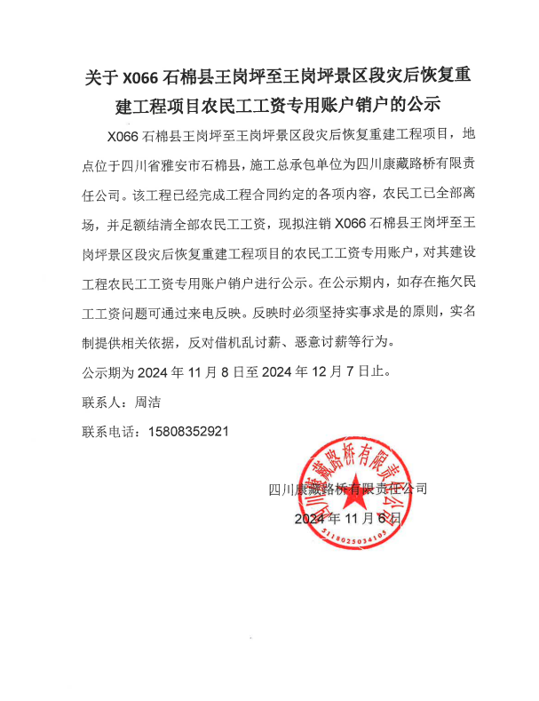 關于X066石棉縣王崗坪至王崗坪景區(qū)段災后恢復重建工程項目農(nóng)民工工資專用賬戶銷戶的公示