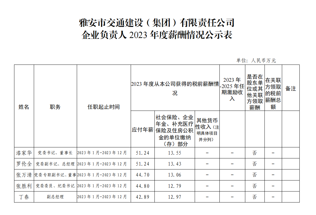 雅安市交通建設(集團)有限責任公司 企業(yè)負責人2023年度薪酬情況公示表