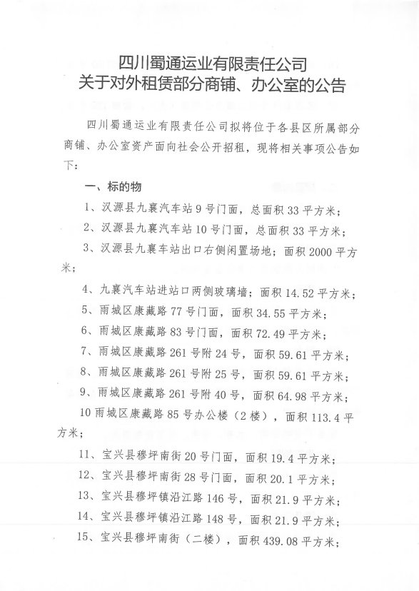 ËÄ´¨Êñͨß\˜I(y¨¨)ÓÐÏÞØŸÈι«Ë¾êPÓÚŒ¦Íâ×âÙU²¿·ÖéTÃæ¡¢Þk¹«ÊÒÙY®aµÄ¹«¸æ